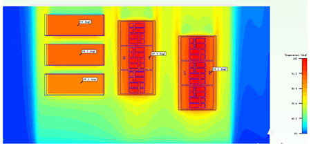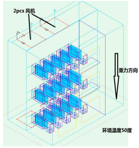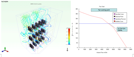 Schematic of thermal simulation results and fan operating points of the model of VFD module:
