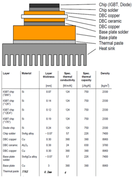 Below figure on the left is the figure of the InfineonFF600R17 internal structure and the schematic of heat-dissipating elements. The total power is 660W. We assume the thermal interface material as Thermal grease 7762 with a thickness of 0.2mm.
