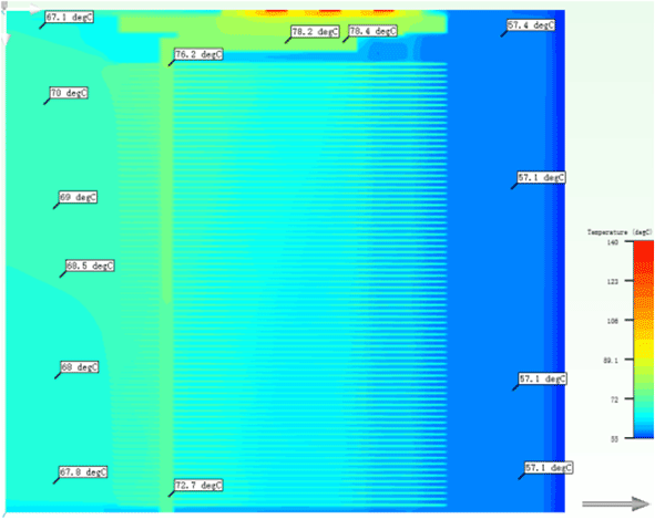 (散熱器實際進風溫度~57.1?C,散熱器底板最高溫度85.1?C,理論分析溫升28?C)