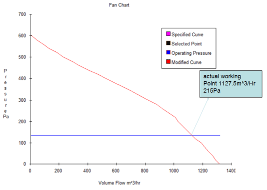 假設系統阻抗80Pa,修正單體通過散熱器風機曲線圖如下: